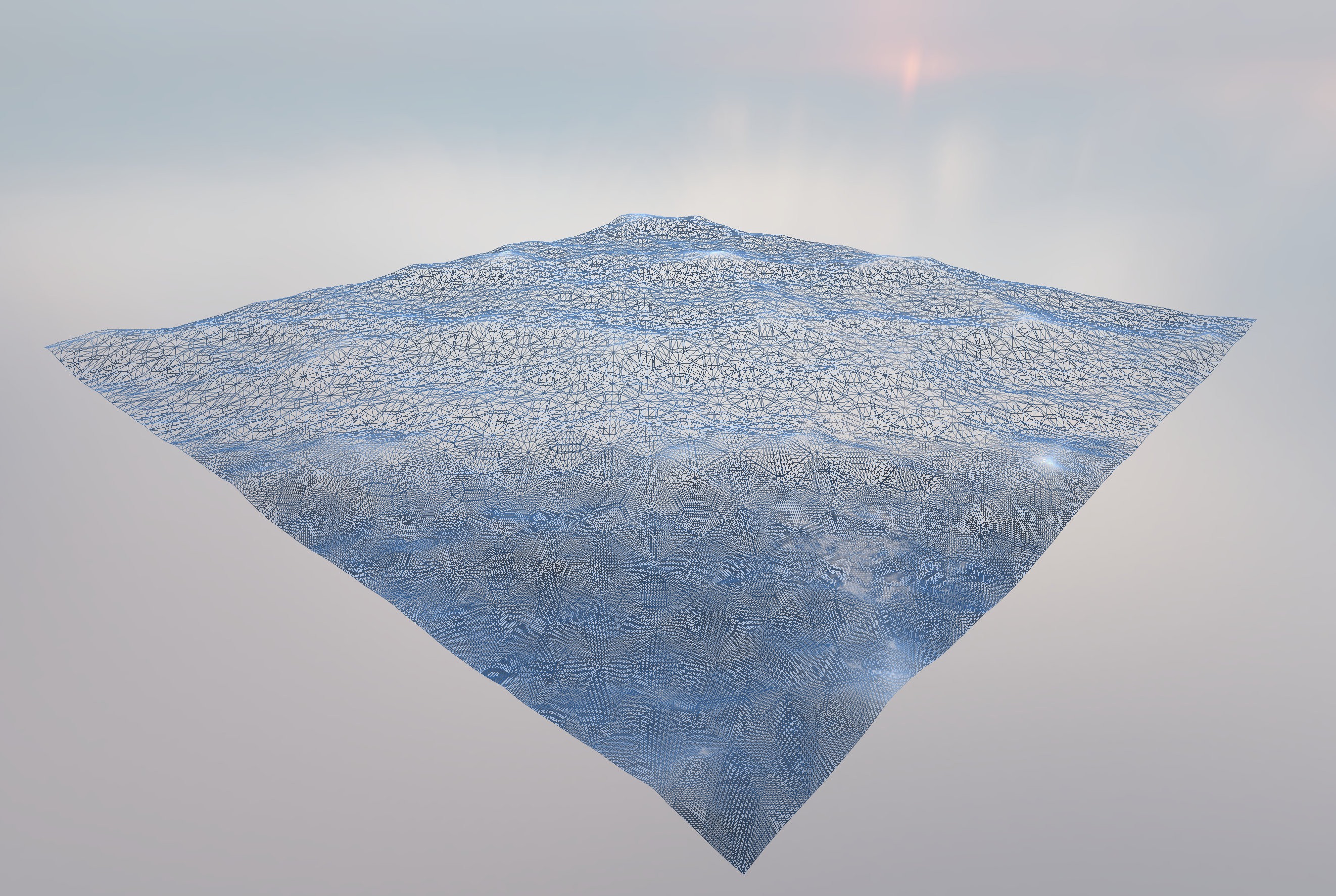 Dynamic level of detail was also added to the program to help with performance. Since each wave is being sampled around 64 times per vertex, this can add a lot of computation overhead on each draw call. With this in mind, I chose to explore the topic we discussed over the quarter relating to geometry manipulation via mesh upsampling and downsampling. This stage of the program was implemented using OpenGL's tessellation shader pipeline.